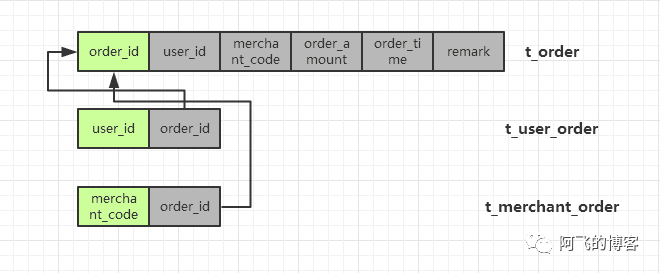冗余关系索引表的情况如下--只有一个sharding column的分库分表的数据是全量的,其他分库分表只是与这个sharding column的关系表,这样做的优点是节省空间,缺点是除了第一个sharding column的查询,其他sharding column的查询都需要二次查询,这三张表的关系如下图所示(浅绿色字段就是sharding column):
