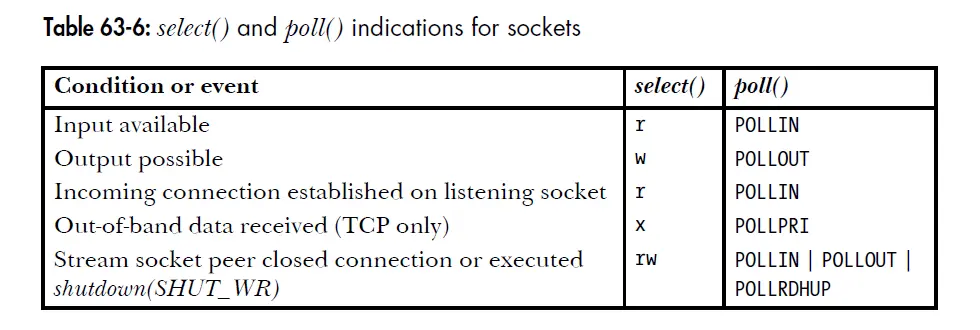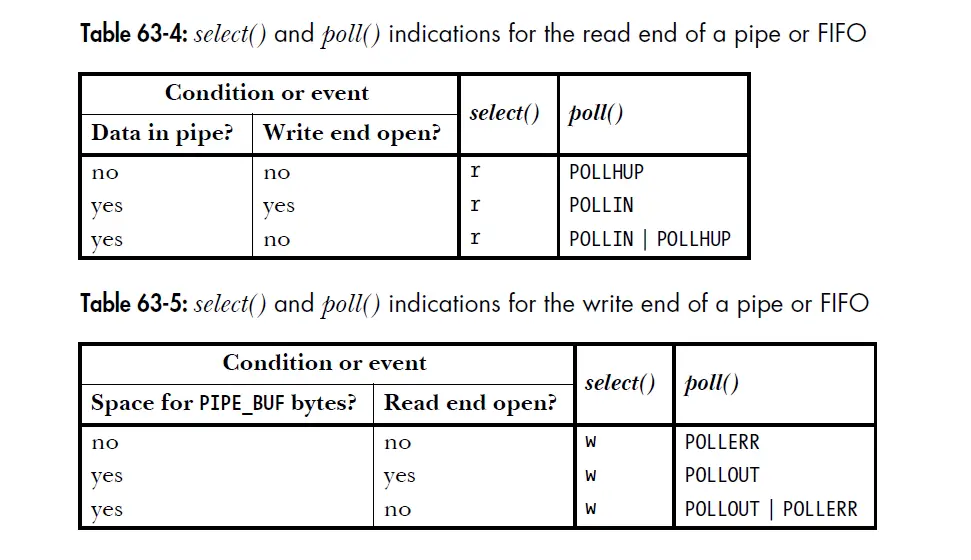 - 总会被select标记为可读,可写,poll后再revents中返回POLLIN,POLLOUT