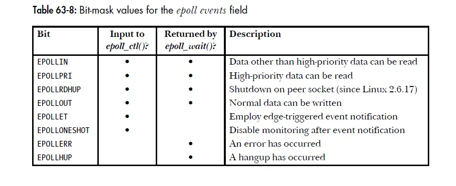 int epoll_wait(int epfd, struct epoll_event *evlist, int maxevents, int timeout);