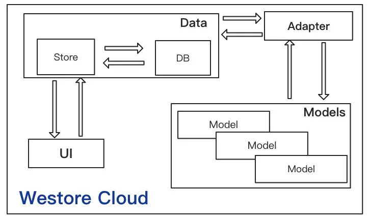 Westore Cloud 在基于小程序云的数据库能力,让开发者感知不到数据库的存在(隐形云),只需要专注于本地数据、本地数据逻辑和本地数据的流动,通过简单的 pull、push、add 和 remove 同步本地数据和云数据库。数据库相关的官方文档可以点这里。架构图如下所示: