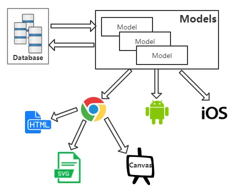 Model first 的架构里,如果不需要持久化存储,可以去掉 Database,只剩下 Models。Models 与渲染无关,专注于模型的抽象与模型之间的逻辑,具体是渲染到 Web、安卓、IOS 还是 Flash 或者 WPF 统统不属于 Models 需要操心的问提。