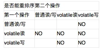 **内存屏障(Memory Barrier)**是一类同步屏障指令,是CPU或编译器在对内存随机访问的操作中的一个同步点,使得此点之前的所有读写操作都执行后才可以开始执行此点之后的操作。下表描述了和volatile有关的指令重排禁止行为: