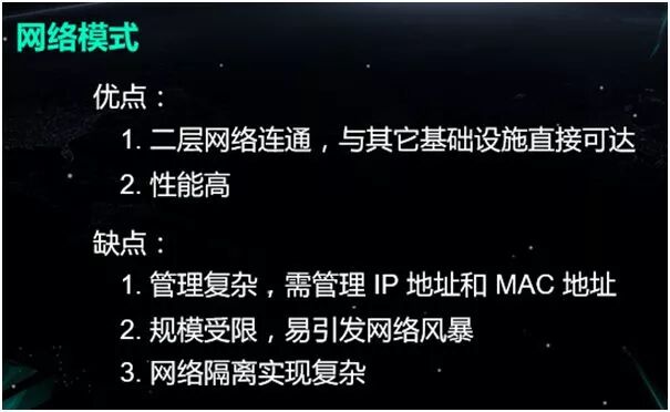 缺点:管理较为复杂,需要我们自己手动的去管理容器的 IP 和 MAC 地址。 由于整体处于网络大二层,一旦系统达到了一定规模,网络中的 ARP 包会产生网络广播风暴,甚至会偶发出现 PPS(Package Per Second)过高,网络间歇性不通等奇怪的现象。