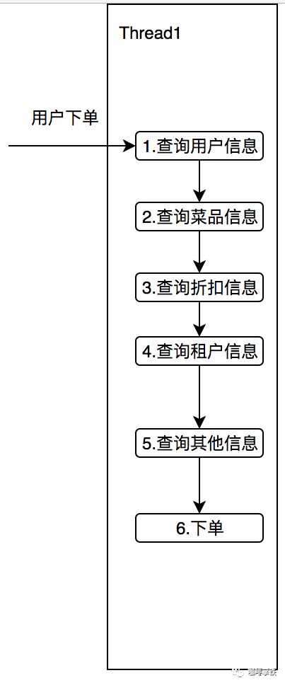 我们可以想想有这么一个需求,在你下外卖订单的时候,这笔订单可能还需要查,用户信息,折扣信息,商家信息,菜品信息等,用同步的方式调用,如下图所示: