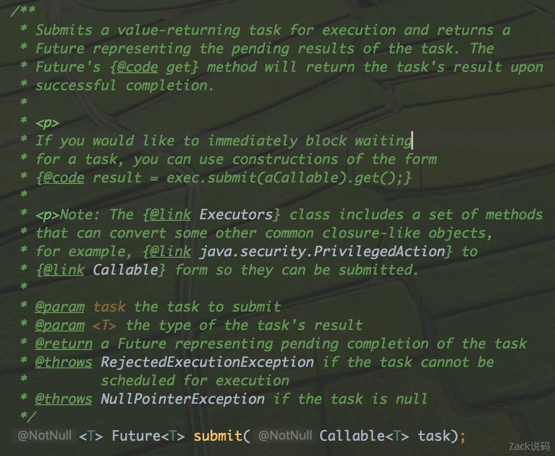 ExecutorService.submit()定义一个接口。这个接口接收一个Callable参数(执行的任务),返回一个Future(计算结果)。