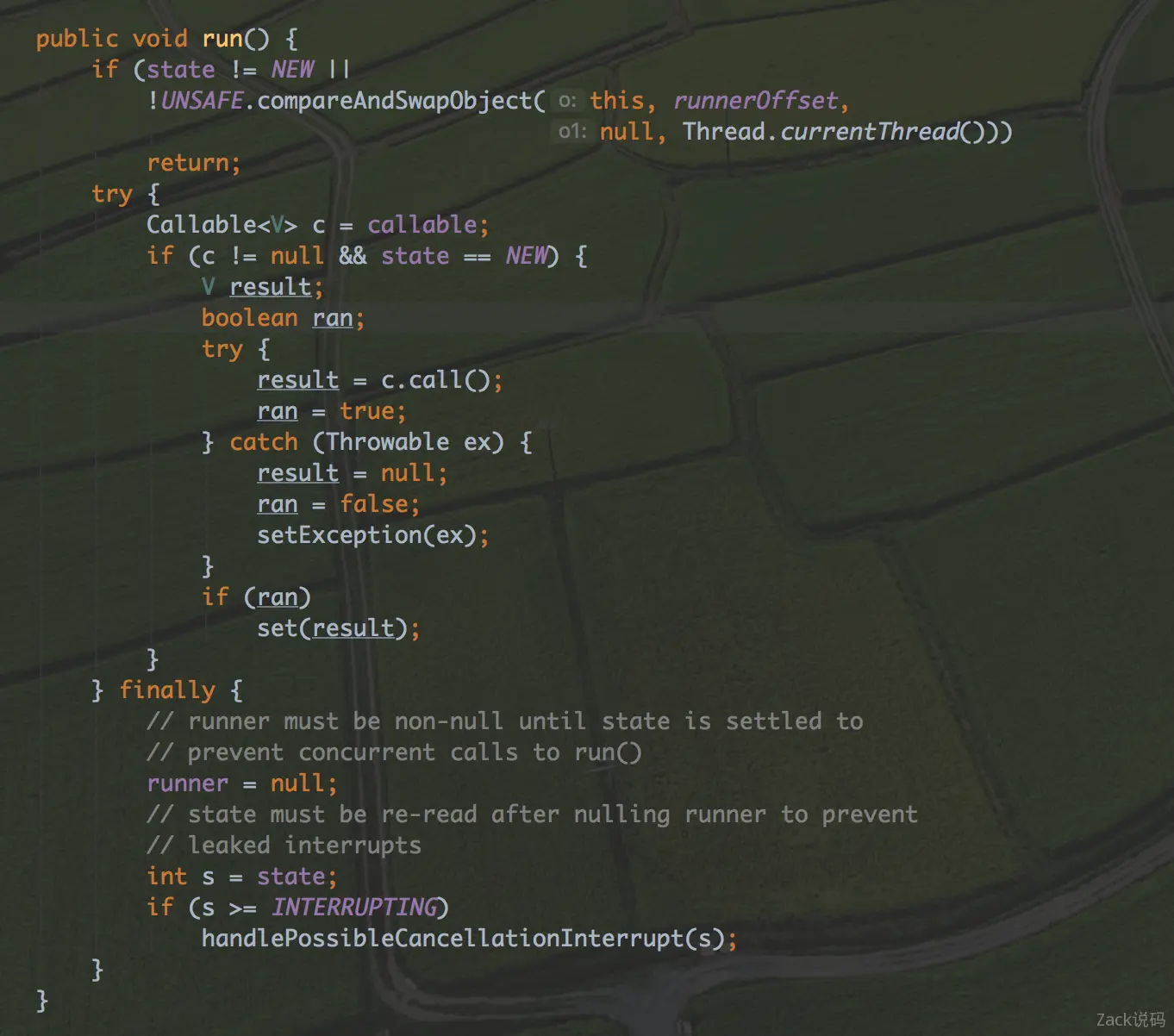 futureTask对象的state状态,如果不是NEW的话,证明已经开始运行过了,则退出执行。同时futureTask对象通过CAS,把当前线程赋值给变量runner(是Thread类型,说明对象使用哪个线程执行的),如果CAS失败则退出。