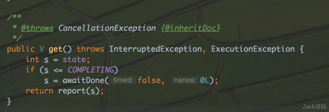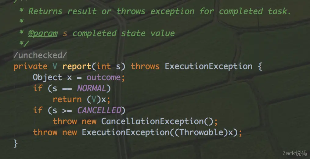 get()方法分两步。第一步,先判断状态,如果计算为完成,则需要阻塞地等待完成。第二步,如果完成了,则调用report()方法获取结果并返回。