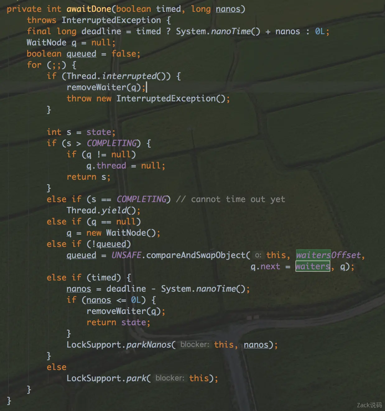 state为NEW,还没开始执行。那么程序在当前循环现在会新增一个WaitNode,在下一个循环里面调用LockSupport.park()把当前线程阻塞。当run()方法结束的时候,会再次唤醒此线程,避免自旋消耗CPU时间。 - 如果选用了超时功能,在阻塞和自旋过程中超时了,则会返回当前超时的状态。