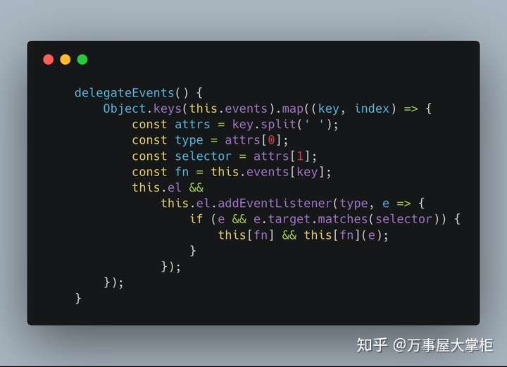 这里用的是代理模式。用一个根节点el代理所有的事情,在事件触发的判断是不是对应的选择器。Dom里面有个matches可以判断是否。如果匹配我们就调用eventhandlers.