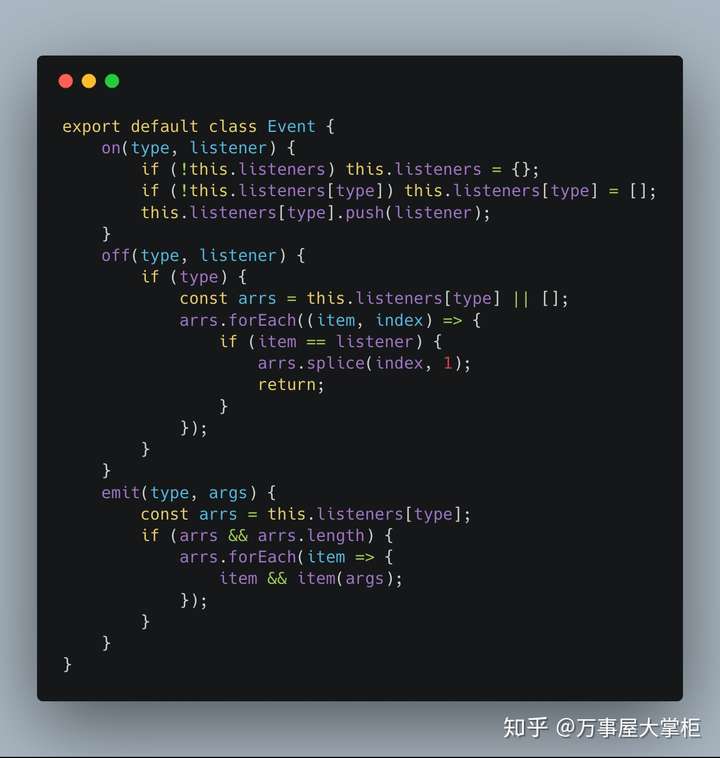 首先我们创建一个Event对象,里面用几个函数on(type, listener) ,off(type, listener),emit(type, args)分别表示监听某种事件、取消监听和触发三个操作。