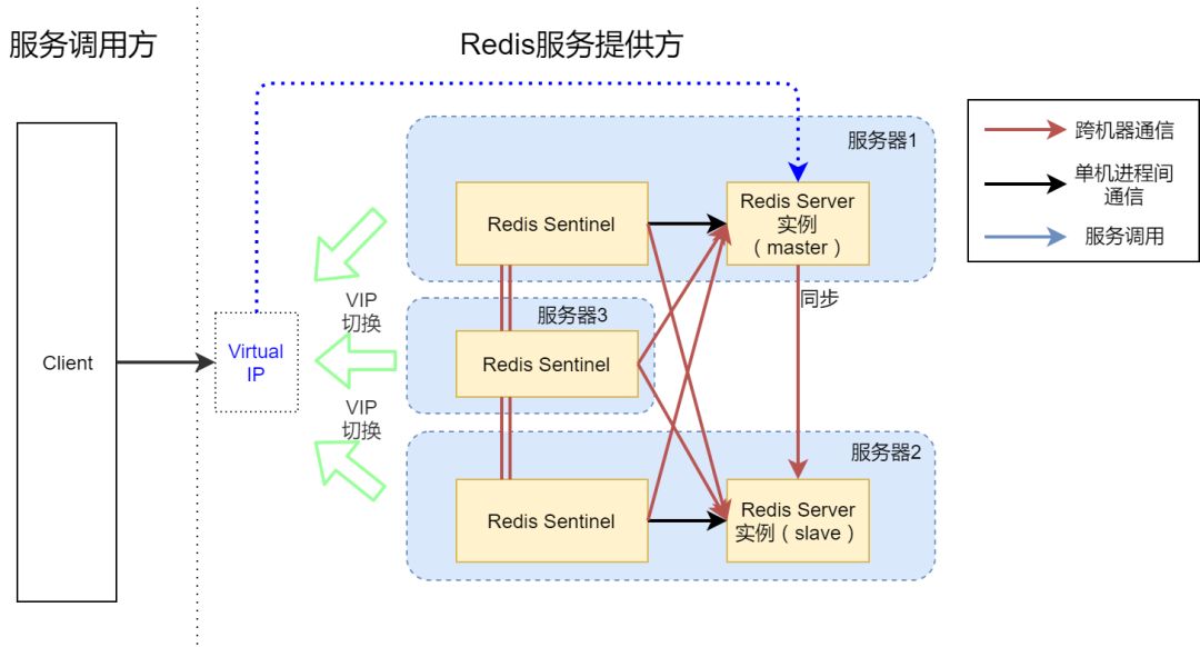 答案当然是肯定的。这可能就要引入虚拟IP(Virtual IP,VIP),如上图所示。我们可以把虚拟IP指向Redis Server master所在的服务器,在发生Redis主从切换的时候,会触发一个回调脚本,回调脚本中将VIP切换至slave所在的服务器。这样对于Client端来说,他仿佛在使用的依然是一个单机版的高可用Redis服务。