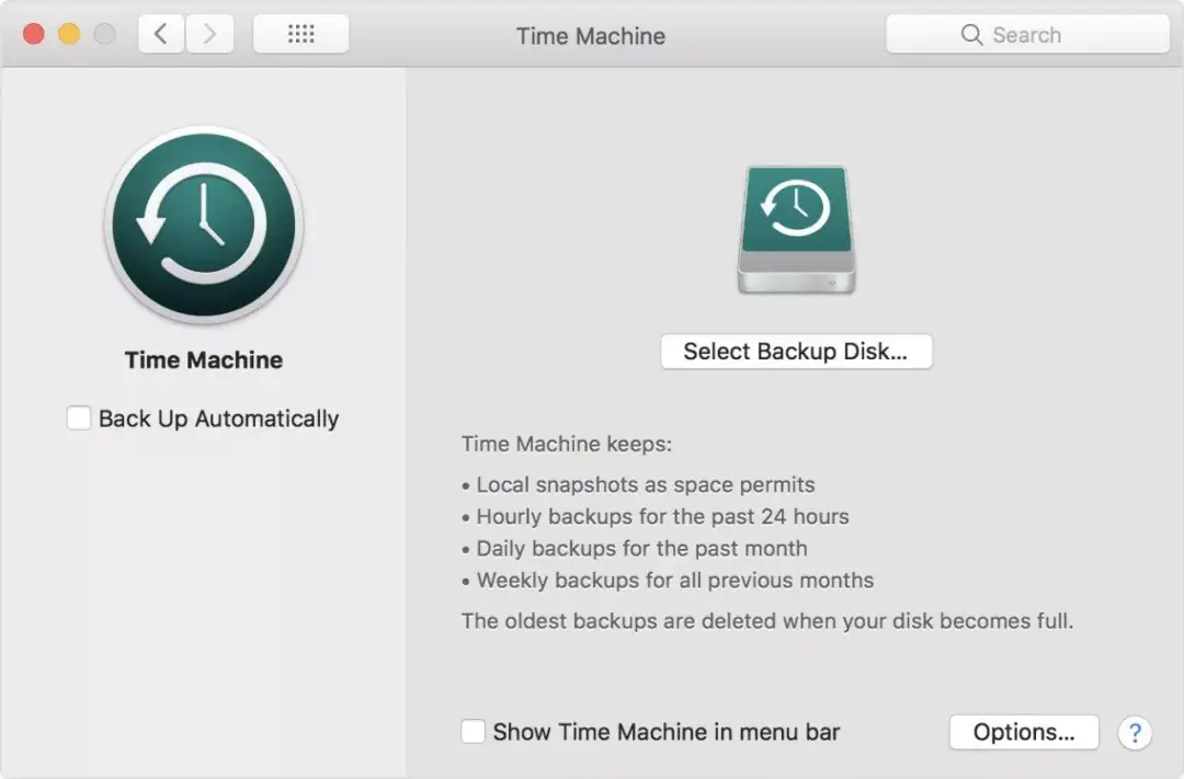 最后来说说对整个操作系统备份--Time Machine(时光机器),它是 Mac OS X 内置的备份工具,它可以自动按照每小时,每天或者每周来对你的苹果电脑进行备份。