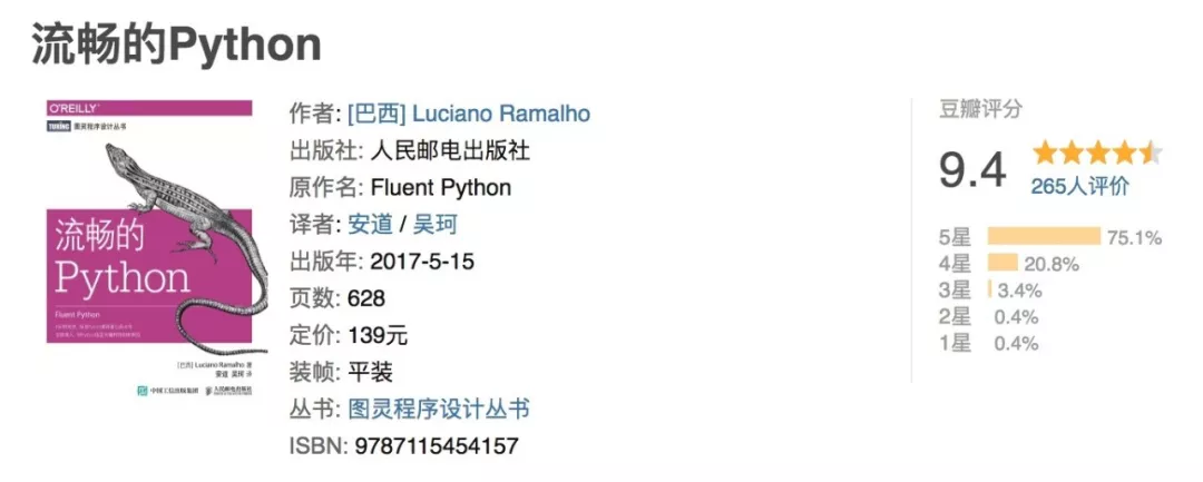 第二本书我推荐的是「流畅的Python」,这本书记得一开始出来的时候纸质书达到200人民币,我还是在图灵社区花了76购买的电子版,通读下来书中非常多的Python高级技巧方式方法。