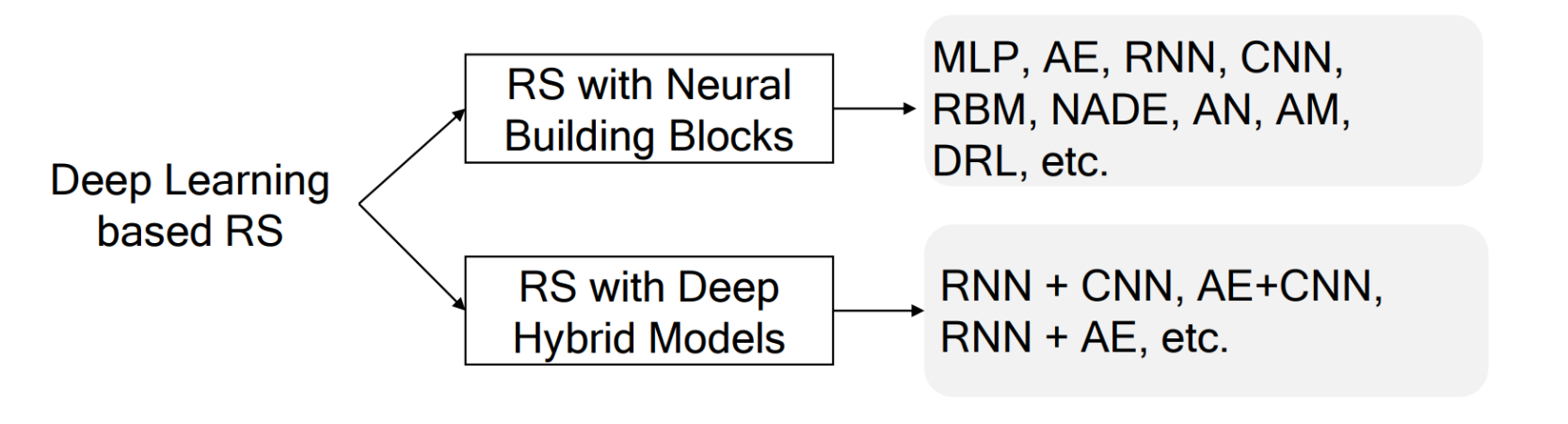 - Recommendation with Neural Building Blocks: 使用单个深度学习方法的推荐。我们按照之前的八种技术分类分别讨论不同的推荐方法。