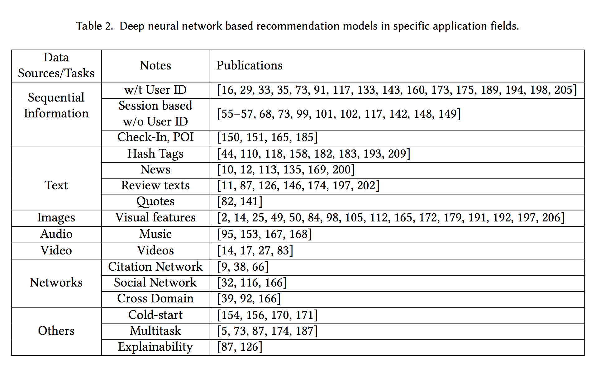 表1列出了所有已被调查的模型,我们按照上述分类方案对其进行组织。 此外,我们还从表2中的任务角度总结了一些publications。我们调查的publications涉及各种推荐任务。 由于使用深度神经网络(例如基于会话的推荐,图像,视频推荐),一些原来不常见的任务已开始受到关注。 一些任务对于推荐研究领域可能并不新颖,但DL提供了更多找到更好解决方案的可能性。 例如,如果没有深度学习技巧的帮助,处理图像和视频将是一项艰巨的任务。 而深度神经网络的序列建模功能可以轻松捕获用户行为的顺序模式。