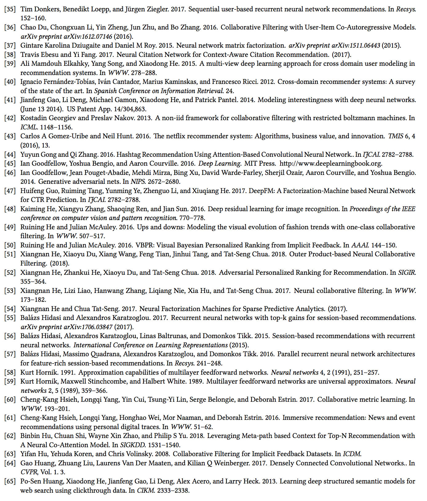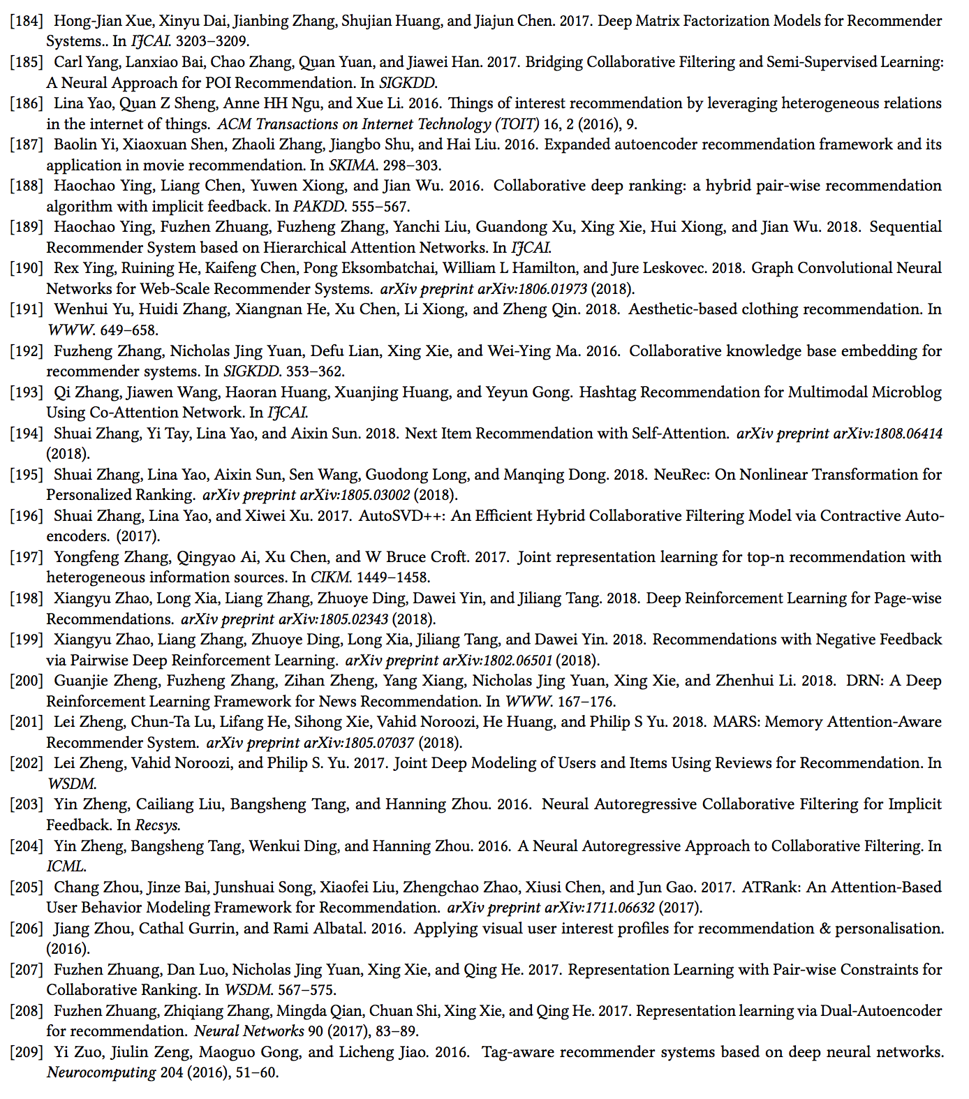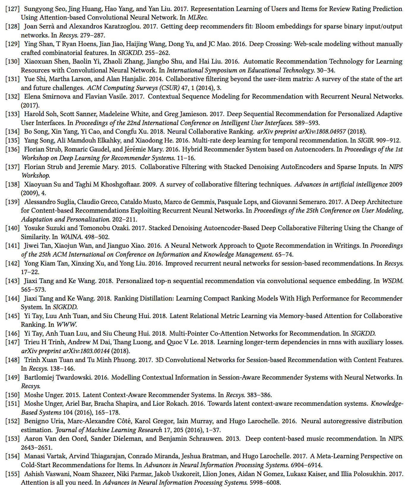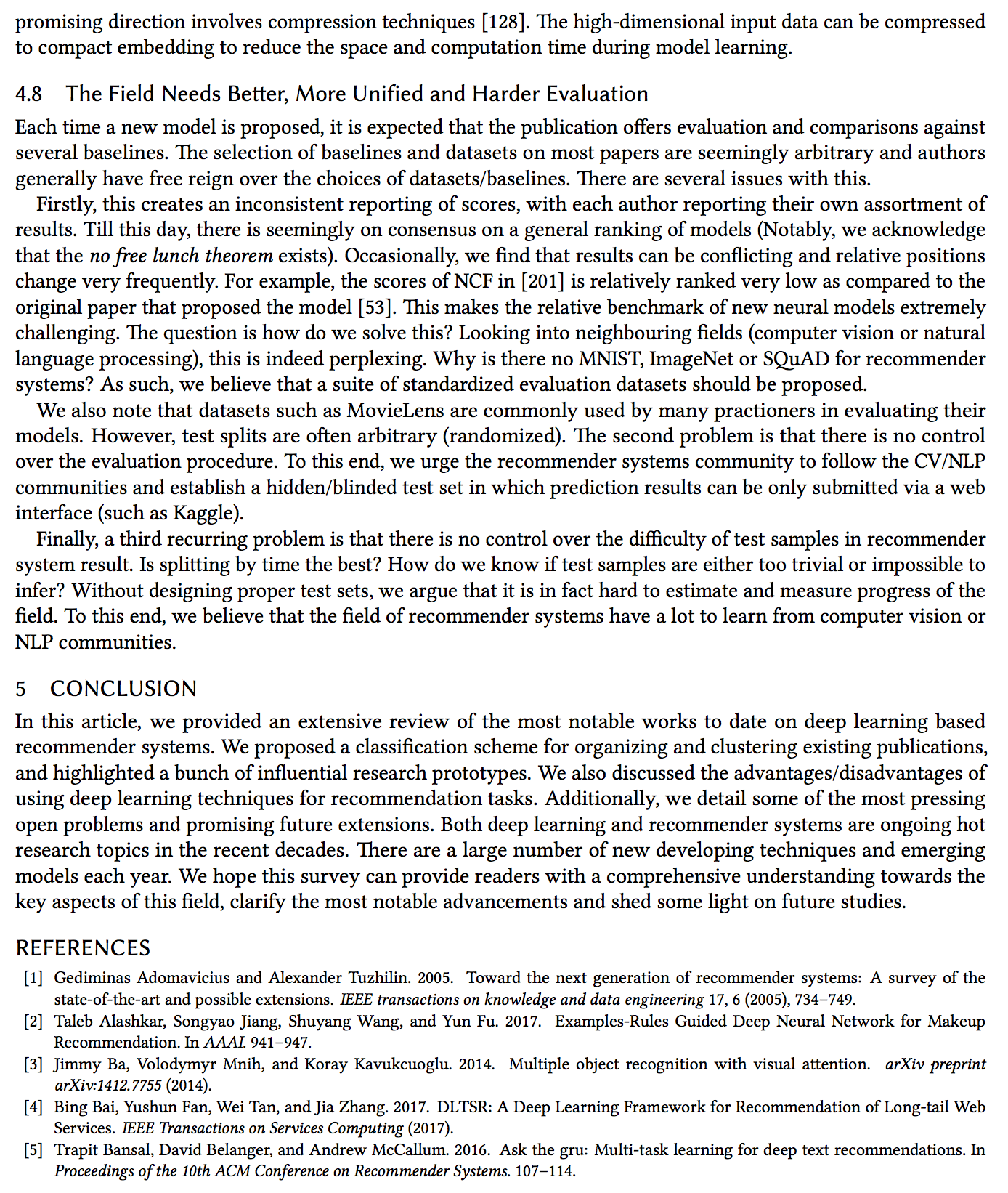 - 数据要求。第二个可能的限制是,深度学习被认为是数据饥渴的,因为它需要足够的数据才能完全支持其丰富的参数化。然而,与标记数据稀缺的其他领域(例如语言或视觉)相比,在推荐系统研究的背景下获得大量数据相对容易。百万/亿级别的数据集不仅在工业中很常见,而且也作为学术数据集发布。
