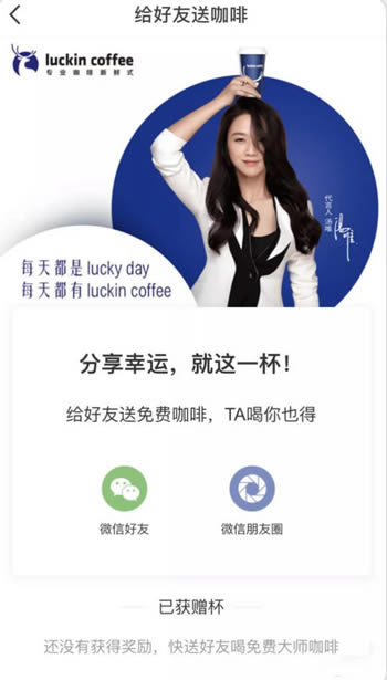 luckin coffee App内一直在主推「免费送给好友咖啡,各自得一杯」的活动。