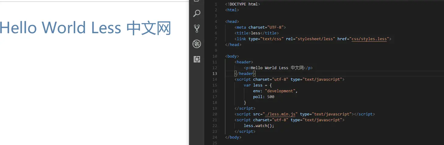 浏览器中调用有个好处:可以开启监视模式,只要我们的LESS改变,在一定时间内,浏览器就会重新的编译,我们可以看到想要的效果。具体操作如下: