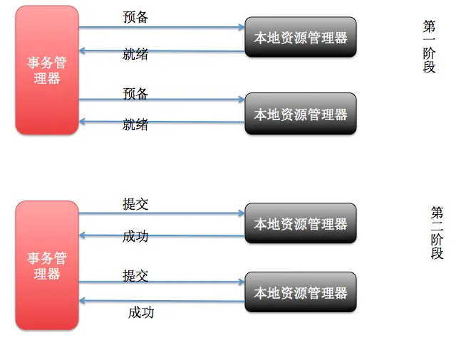 XA是一个分布式事务协议,由Tuxedo提出。XA中大致分为两部分:事务管理器和本地资源管理器。其中本地资源管理器往往由数据库实现,比如Oracle、DB2这些商业数据库都实现了XA接口,而事务管理器作为全局的调度者,负责各个本地资源的提交和回滚。XA实现分布式事务的原理如下: