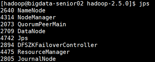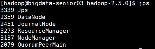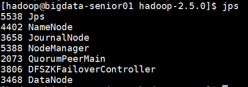 [hadoop@bigdata-senior01 hadoop-2.5.0]$ sbin/hadoop-daemon.sh start journalnode[hadoop@bigdata-senior02 hadoop-2.5.0]$ sbin/hadoop-daemon.sh start journalnode[hadoop@bigdata-senior03 hadoop-2.5.0]$ sbin/hadoop-daemon.sh start journalnodejps命令查看是否启动。