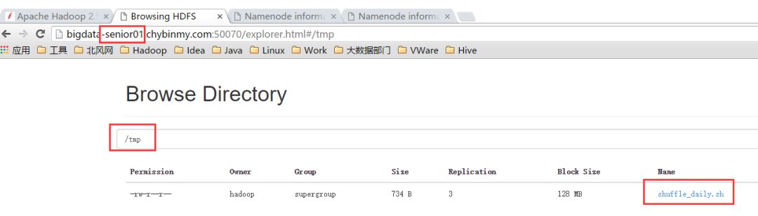 #修改core-site.xml在bigdata-senior01机器上,修改core-site.xml文件,指定连接的NameNode是第一台NameNode。[hadoop@bigdata-senior01 hadoop-2.5.0]$ vim etc/hadoop/core-site.xml<configuration> <property> <name>fs.defaultFS</name> <value>hdfs://bigdata-senior01.chybinmy.com:8020</value> </property><property> <name>hadoop.tmp.dir</name> <value>/opt/modules/hadoopfederation/hadoop-2.5.0/data/tmp</value></property></configuration>#在bigdate-senior01上传一个文件到HDFS[hadoop@bigdata-senior01 hadoop-2.5.0]$ bin/hdfs dfs -mkdir /tmp[hadoop@bigdata-senior01 hadoop-2.5.0]$ bin/hdfs dfs -put ~/shuffle_daily.sh /tmp/shuffle_daily.sh#查看HDFS文件