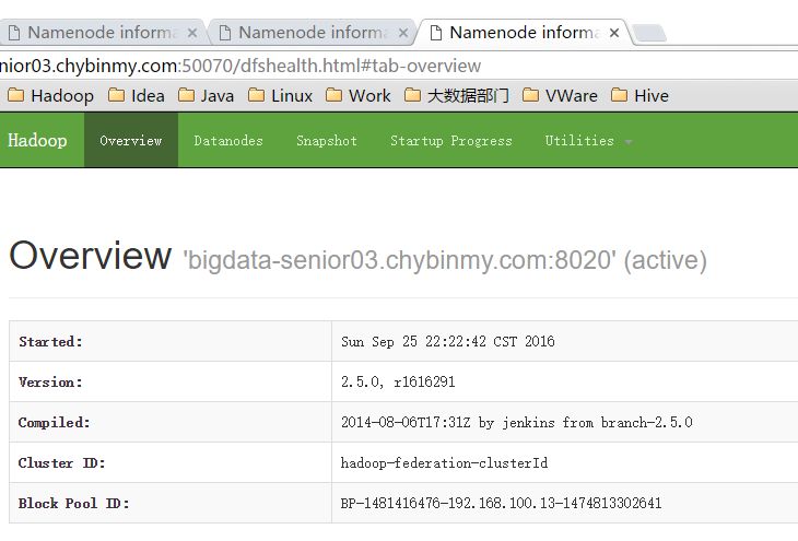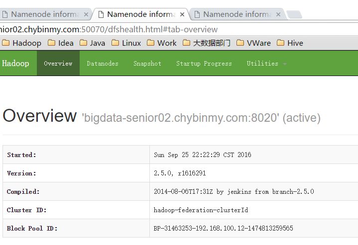 #创建HDFS Federation 版本Hadoop程序目录在bigdata01上创建目录/opt/modules/hadoopfederation /用来存放Hadoop Federation环境。[hadoop@bigdata-senior01 modules]$ mkdir /opt/modules/hadoopfederation#新解压Hadoop 2.5.0[hadoop@bigdata-senior01 ~]$ tar -zxf /opt/sofeware/hadoop-2.5.0.tar.gz -C /opt/modules/hadoopfederation/# 配置Hadoop JDK路径修改hadoop-env.sh、mapred-env.sh、yarn-env.sh文件中的JDK路径。export JAVA_HOME=”/opt/modules/jdk1.7.0_67”#配置hdfs-site.xml<configuration><property><!—配置三台NameNode --> <name>dfs.nameservices</name> <value>ns1,ns2,ns3</value> </property> <property><!—第一台NameNode的机器名和rpc端口,指定了NameNode和DataNode通讯用的端口号 --> <name>dfs.namenode.rpc-address.ns1</name> <value>bigdata-senior01.chybinmy.com:8020</value> </property> <property><!—第一台NameNode的机器名和rpc端口,备用端口号 --> <name>dfs.namenode.serviceerpc-address.ns1</name> <value>bigdata-senior01.chybinmy.com:8022</value> </property> <property><!—第一台NameNode的http页面地址和端口号 --> <name>dfs.namenode.http-address.ns1</name> <value>bigdata-senior01.chybinmy.com:50070</value> </property><property><!—第一台NameNode的https页面地址和端口号 --> <name>dfs.namenode.https-address.ns1</name> <value>bigdata-senior01.chybinmy.com:50470</value> </property> <property> <name>dfs.namenode.rpc-address.ns2</name> <value>bigdata-senior02.chybinmy.com:8020</value> </property> <property> <name>dfs.namenode.serviceerpc-address.ns2</name> <value>bigdata-senior02.chybinmy.com:8022</value> </property> <property> <name>dfs.namenode.http-address.ns2</name> <value>bigdata-senior02.chybinmy.com:50070</value> </property> <property> <name>dfs.namenode.https-address.ns2</name> <value>bigdata-senior02.chybinmy.com:50470</value></property><property> <name>dfs.namenode.rpc-address.ns3</name> <value>bigdata-senior03.chybinmy.com:8020</value> </property> <property> <name>dfs.namenode.serviceerpc-address.ns3</name> <value>bigdata-senior03.chybinmy.com:8022</value> </property> <property> <name>dfs.namenode.http-address.ns3</name> <value>bigdata-senior03.chybinmy.com:50070</value> </property> <property> <name>dfs.namenode.https-address.ns3</name> <value>bigdata-senior03.chybinmy.com:50470</value> </property> </configuration>#配置core-site.xml<configuration><property> <name>hadoop.tmp.dir</name> <value>/opt/modules/hadoopha/hadoop-2.5.0/data/tmp</value></property></configuration>hadoop.tmp.dir设置hadoop临时目录地址,默认时,NameNode和DataNode的数据存在这个路径下。#配置slaves文件bigdata-senior01.chybinmy.combigdata-senior02.chybinmy.combigdata-senior03.chybinmy.com#配置yarn-site.xml<configuration><property> <name>yarn.nodemanager.aux-services</name> <value>mapreduce_shuffle</value> </property> <property> <name>yarn.resourcemanager.hostname</name> <value>bigdata-senior02.chybinmy.com</value> </property> <property> <name>yarn.log-aggregation-enable</name> <value>true</value> </property> <property> <name>yarn.log-aggregation.retain-seconds</name> <value>106800</value> </property> </configuration>#分发到其他节点分发之前先将share/doc目录删除,这个目录中是帮助文件,并且很大,可以删除。[hadoop@bigdata-senior01 hadoop-2.5.0]$ scp -r /opt/modules/ /opt/modules/hadoopfederation bigdata-senior02.chybinmy.com:/opt/modules[hadoop@bigdata-senior01 hadoop-2.5.0]$ scp -r /opt/modules/hadoopfederation bigdata-senior03.chybinmy.com:/opt/modules#格式化NameNode在第一台上进行NameNode格式化:[hadoop@bigdata-senior01 hadoop-2.5.0]$ bin/hdfs namenode -format -clusterId hadoop-federation-clusterId这里一定要指定一个集群ID,使得多个NameNode的集群ID是一样的,因为这三个NameNode在同一个集群中,这里集群ID为hadoop-federation-clusterId。在第二台NameNode上:[hadoop@bigdata-senior02 hadoop-2.5.0]$ bin/hdfs namenode -format -clusterId hadoop-federation-clusterId在第三台NameNode上:[hadoop@bigdata-senior03 hadoop-2.5.0]$ bin/hdfs namenode -format -clusterId hadoop-federation-clusterId# 启动NameNode在第一台、第二台、第三台机器上启动NameNode:[hadoop@bigdata-senior01 hadoop-2.5.0]$ sbin/hadoop-daemon.sh start namenode[hadoop@bigdata-senior02 hadoop-2.5.0]$ sbin/hadoop-daemon.sh start namenode[hadoop@bigdata-senior03 hadoop-2.5.0]$ sbin/hadoop-daemon.sh start namenode