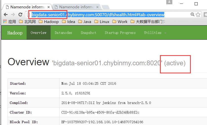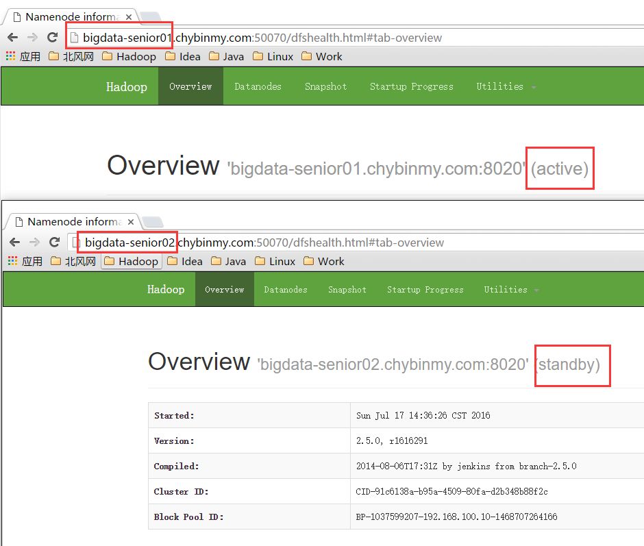 #格式化NameNode在第一台上进行NameNode格式化:[hadoop@bigdata-senior01 hadoop-2.5.0]$ bin/hdfs namenode -format在第二台NameNode上:[hadoop@bigdata-senior02 hadoop-2.5.0]$ bin/hdfs namenode -bootstrapStandby#启动NameNode在第一台、第二台上启动NameNode:[hadoop@bigdata-senior01 hadoop-2.5.0]$ sbin/hadoop-daemon.sh start namenode[hadoop@bigdata-senior02 hadoop-2.5.0]$ sbin/hadoop-daemon.sh start namenode#查看HDFS Web页面,此时两个NameNode都是standby状态。切换第一台为active状态:[hadoop@bigdata-senior01 hadoop-2.5.0]$ bin/hdfs haadmin -transitionToActive nn1可以添加上forcemanual参数,强制将一个NameNode转换为Active状态。[hadoop@bigdata-senior01 hadoop-2.5.0]$ bin/hdfs haadmin –transitionToActive -forcemanual nn1此时从web 页面就看到第一台已经是active状态了。