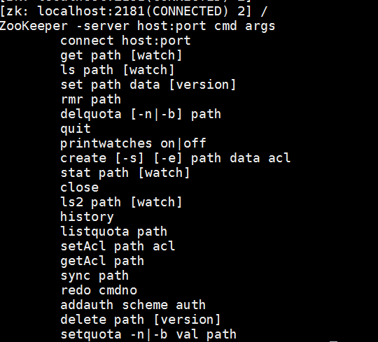 #进入zookeeper Shell:在zookeeper根目录下执行 bin/zkCli.sh进入zk shell模式。zookeeper很像一个小型的文件系统,/是根目录,下面的所有节点都叫zNode。进入zk shell 后输入任意字符,可以列出所有的zookeeper命令#查询zNode上的数据:get /zookeeper#创建一个zNode : create /znode1 “demodata “#列出所有子zNode:ls /#删除znode : rmr /znode1#退出shell模式:quit