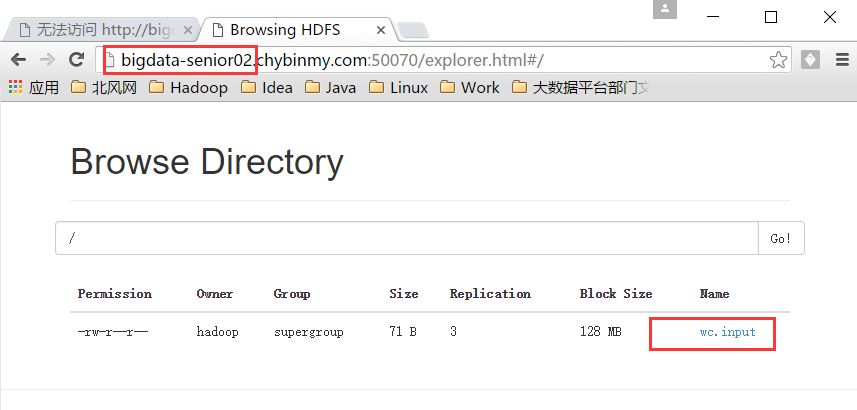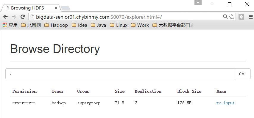 [hadoop@bigdata-senior01 hadoop-2.5.0]$ bin/hdfs dfs -put /opt/data/wc.input /