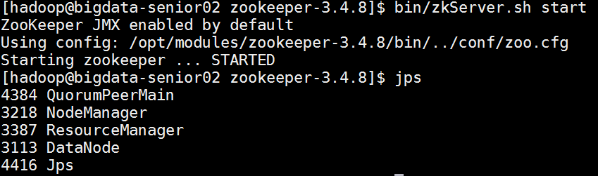 #在三台节点上启动Zookeeper:[hadoop@bigdata-senior01 zookeeper-3.4.8]$ bin/zkServer.sh start[hadoop@bigdata-senior02 zookeeper-3.4.8]$ bin/zkServer.sh start[hadoop@bigdata-senior03 zookeeper-3.4.8]$ bin/zkServer.sh start
