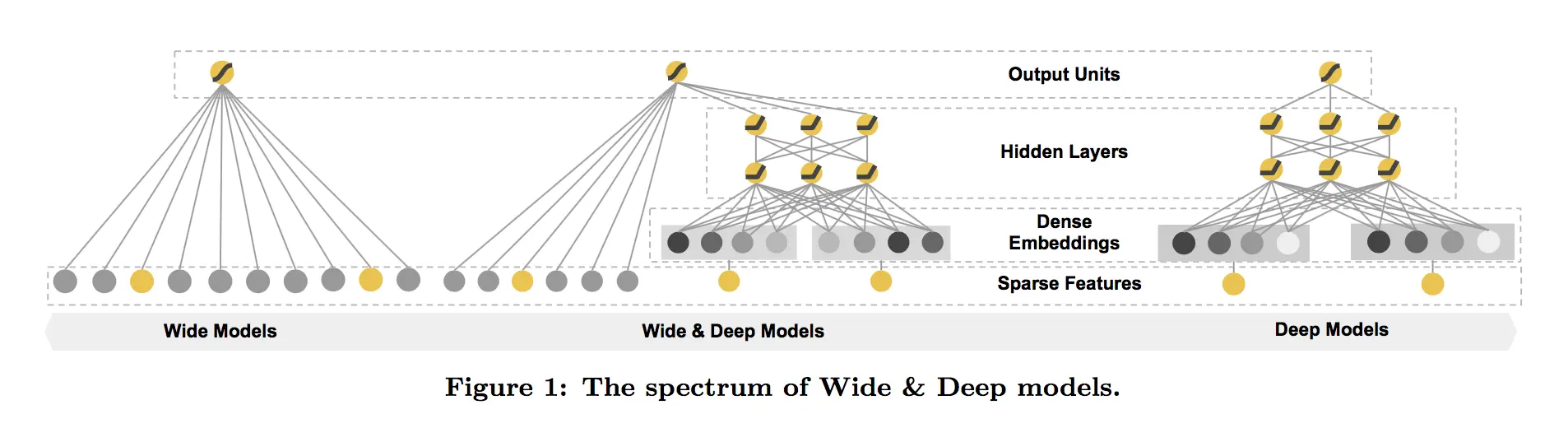 所谓wide model,是指logistic regression等使用人工特征的模型,这些模型尤其常用one-hot编码。这些模型简单可解释,但无法对未在训练集中出现的feature建模。所谓deep model,是指embedding-based models,包括FM和深度神经网络。它们能从稀疏数据中学习到稠密的feature embedding,但如果输入矩阵是稀疏但高秩的,它就可能学习出很多并不存在的关联。