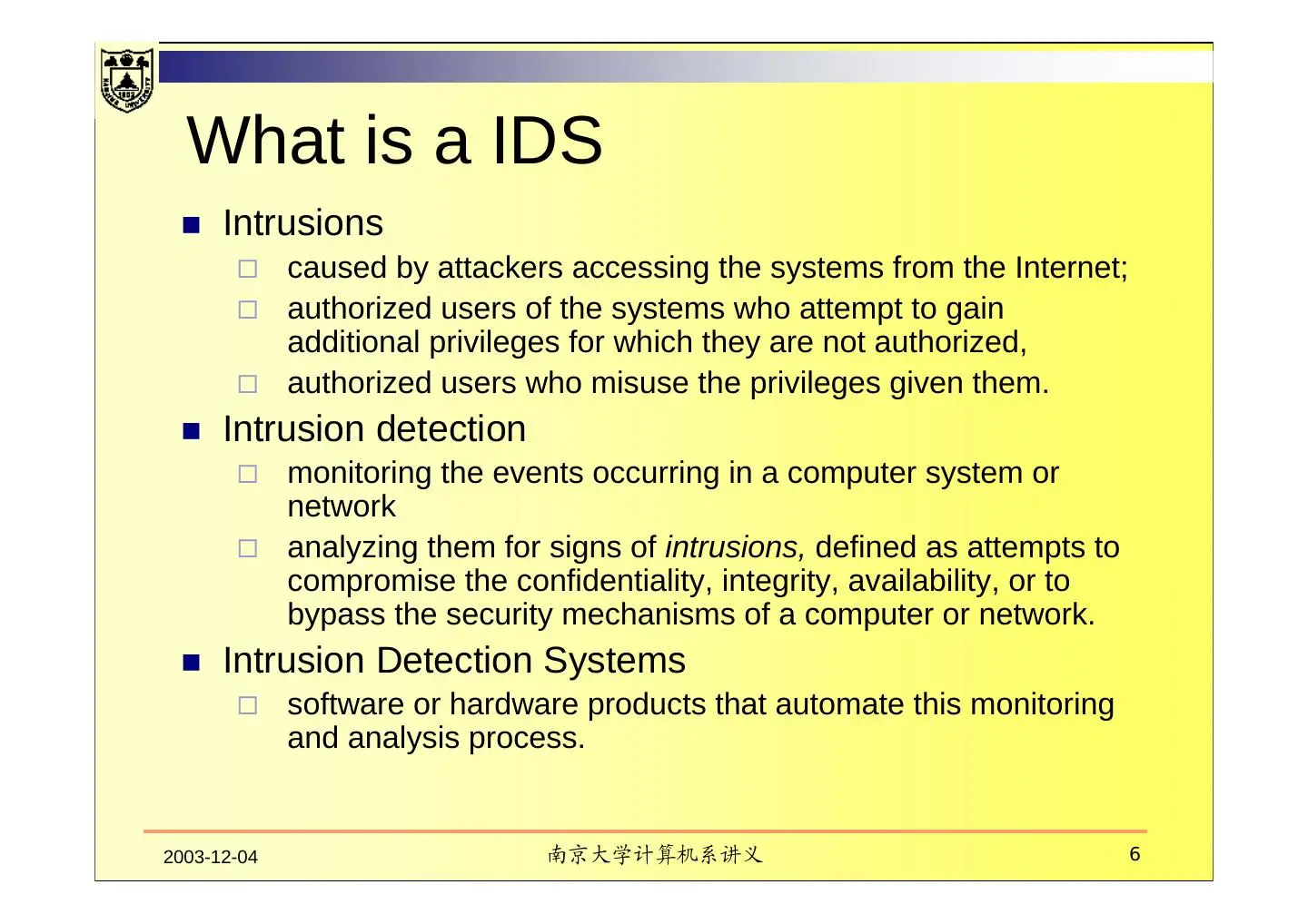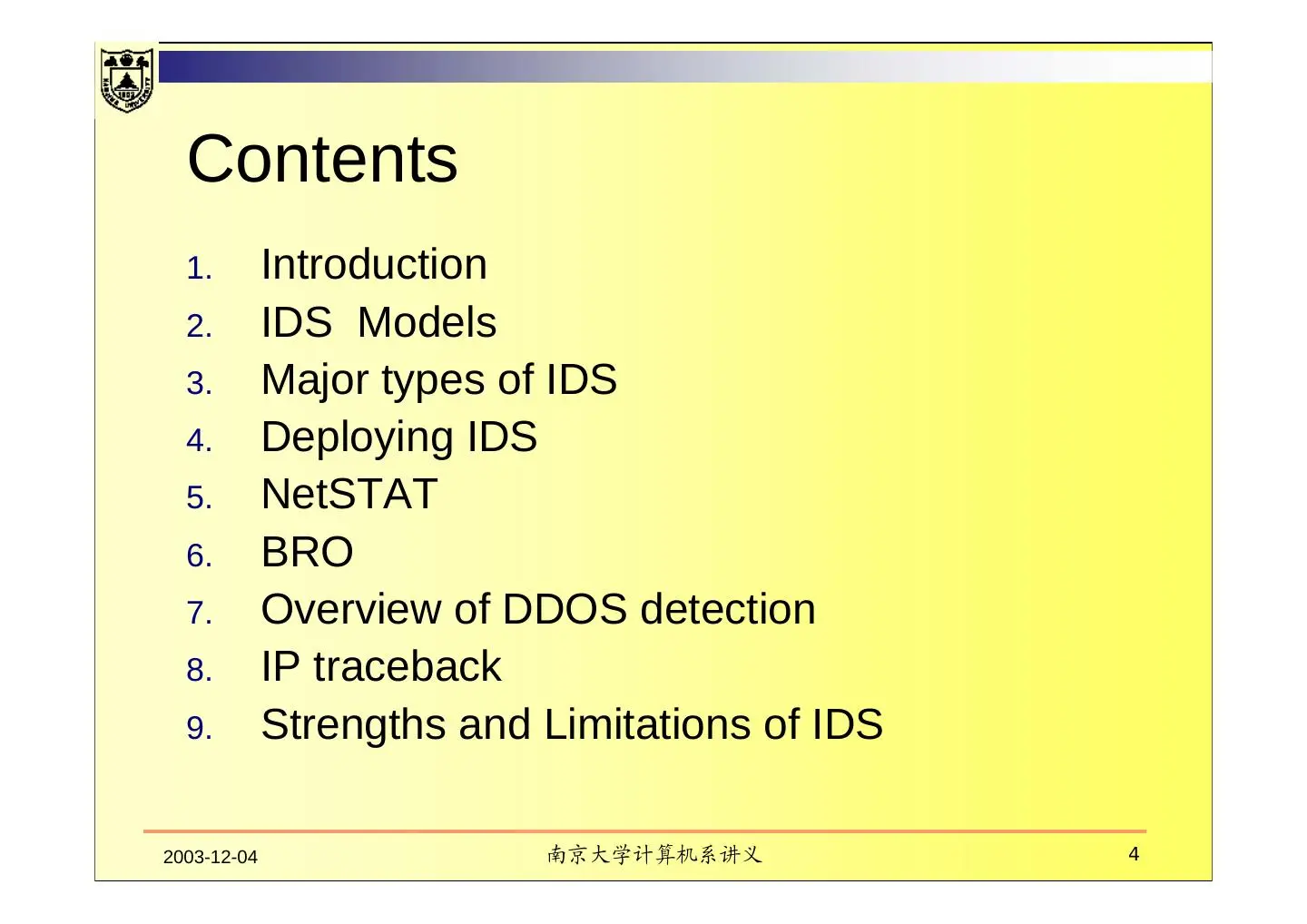 介绍了入侵监测系统(IDS)的相关概念、主要类型、NetSTAT、BRO、DDOS攻击的由来、IP traceback、IDS的优缺点