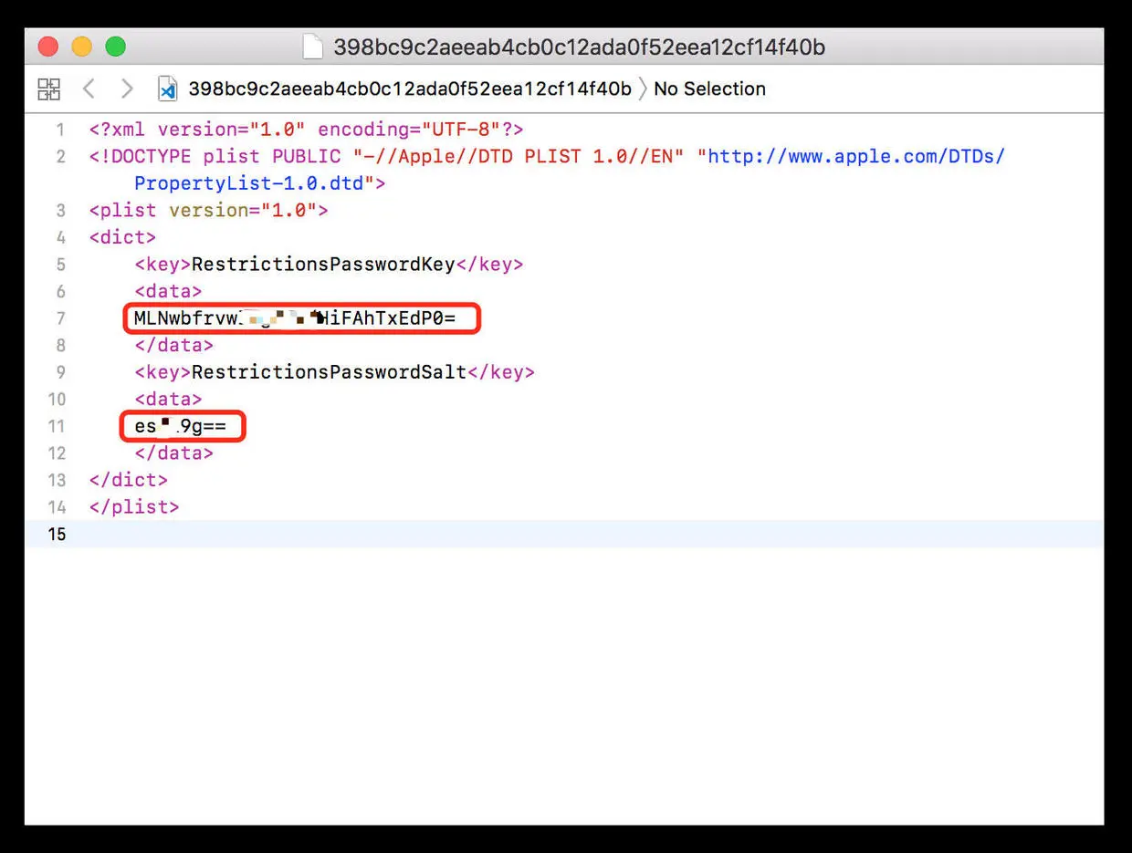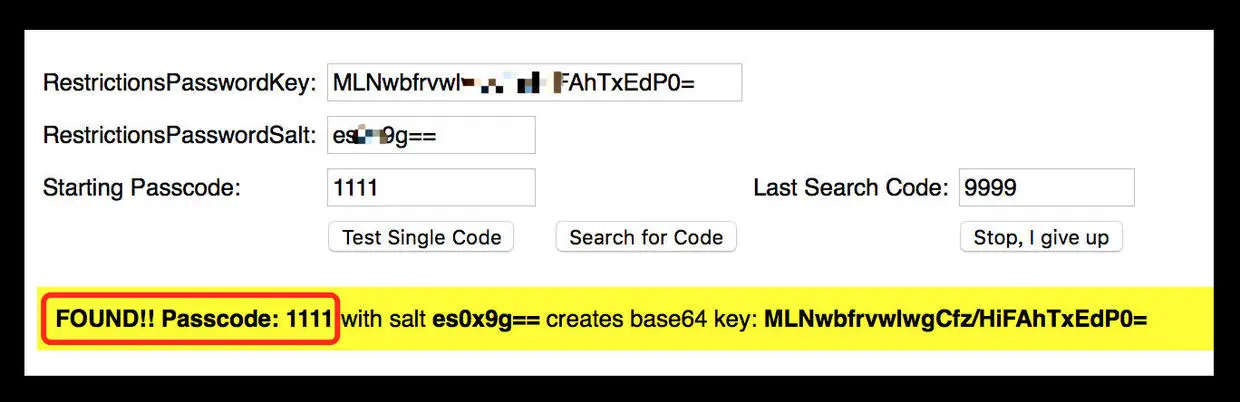 RestrictionsPasswordKey中,较短的一串复制到RestrictionsPasswordSalt中,然后点击Search for Code。