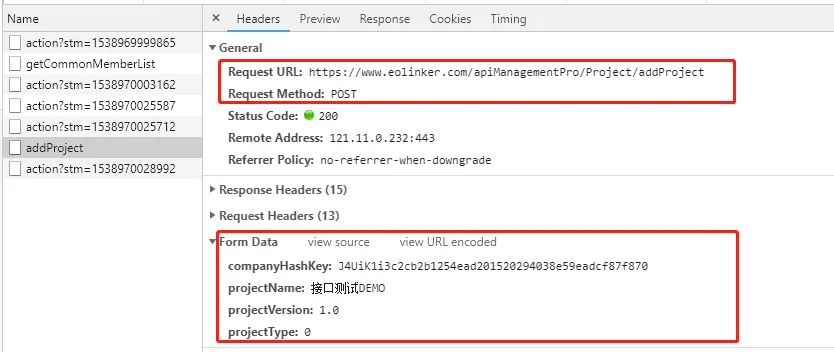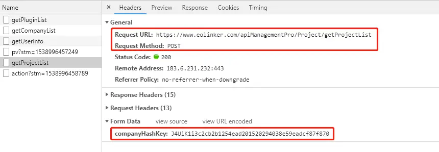 注:实际项目中是有一份开发写好的API文档,可能是Word上,可能是RAP上,也有可能是在eolinker上,我在这里只是为了举例,通过F12取了2个接口的信息(如下面),写了2个不完整的API文档作为本文的操作示例。
