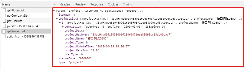 返回内容: {"type":"project","itemNum":4,"statusCode":"000000","projectList":[{"projectHashKey":"83uUHhud0519435001f268f0871eee88090cc68dc00cac7","projectName":"demo_project","projectType":0,"projectDesc":"","projectUpdateTime":"2018-10-08 18:26:57","projectVersion":"1.0","userType":0,"permission":{"userType":0,"endTime":"2099-01-01","isExpire":0}}]}