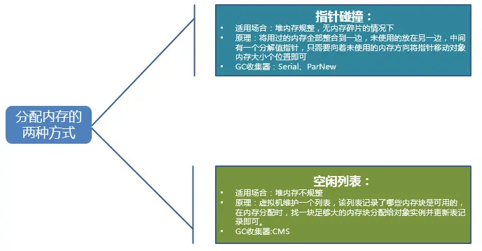 ②.分配内存:类加载检查完成后,虚拟机将为新对象分配内存空间,且对象所需内存空间大小在其完成类加载检查后即可确定,该过程其实就是在堆中划分一小部分的确定大小的空间,用于存储对象信息。其中分配方式有以下两种: