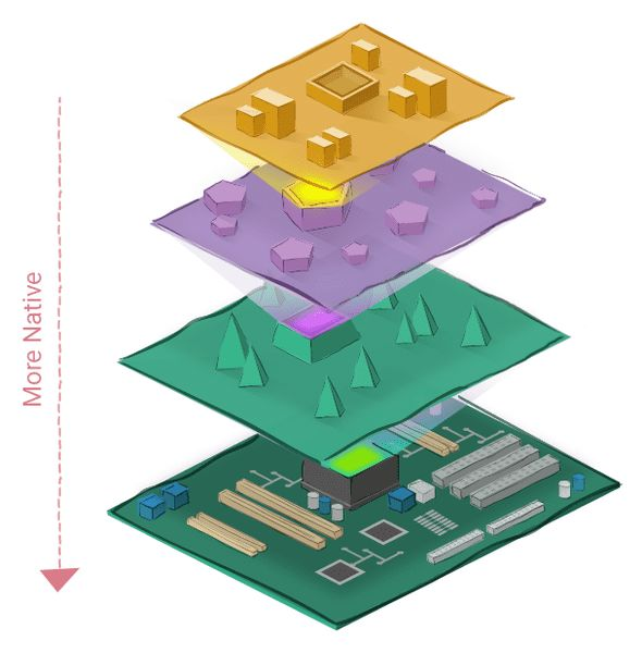 要使得软件可以理解和操作的话,计算机科学家将其划分为多个层,这些层均是由框架构成的,每个框架都运行在另一个框架之上。在所有框架中,越接近硬件的框架,我们就说它更“原生”。