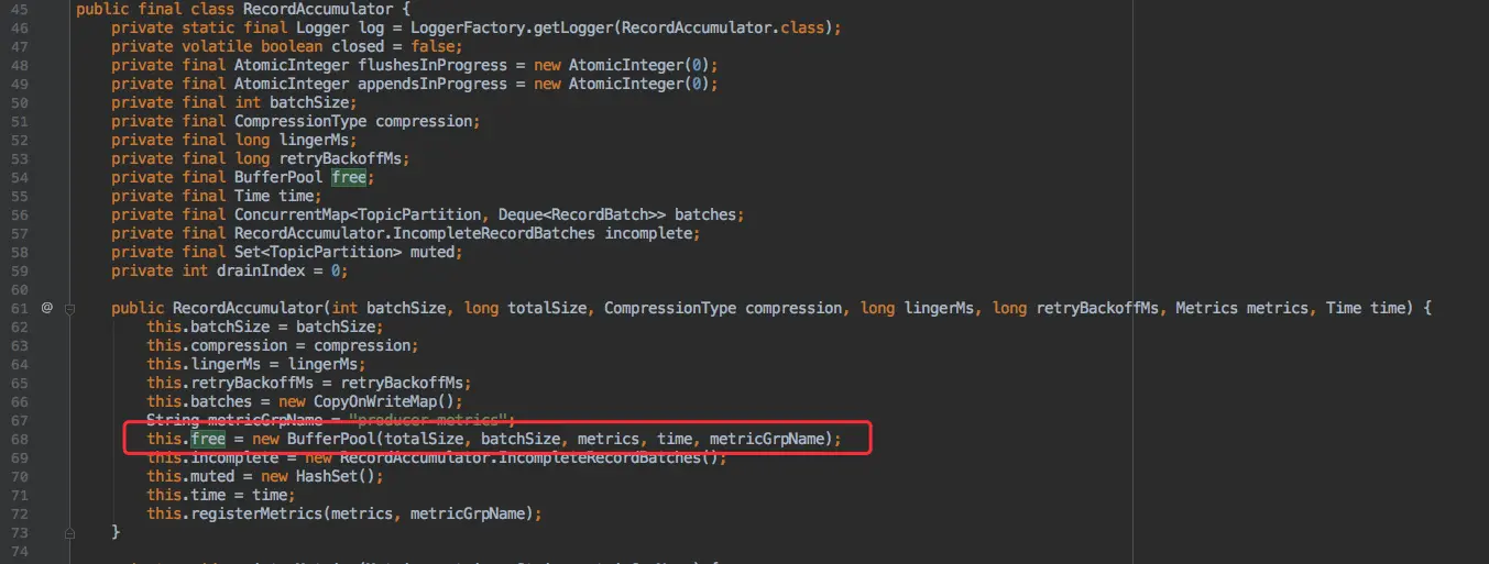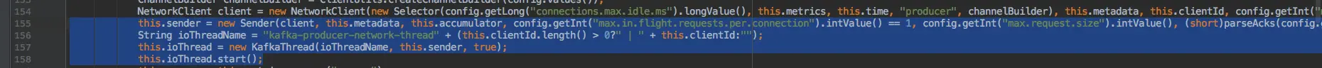 调用该构造方法进行初始化时,不止是简单的将基本参数写入 KafkaProducer。比较麻烦的是初始化 Sender 线程进行缓冲区消费。