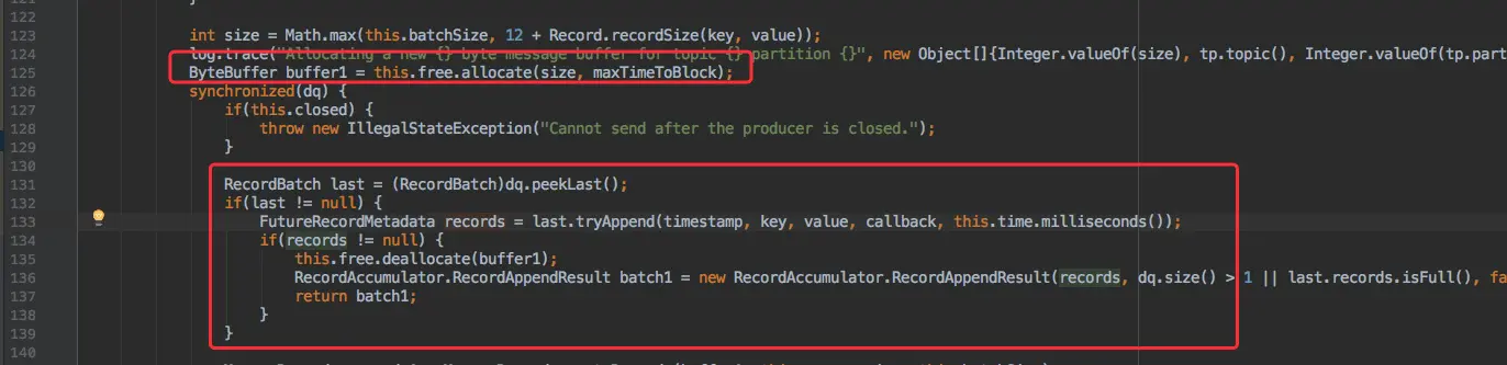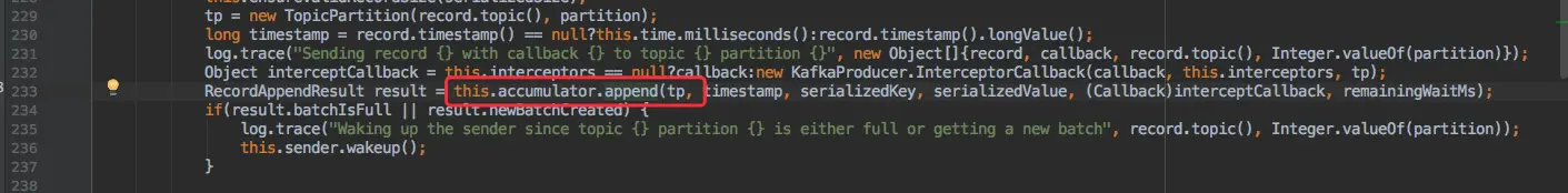 在 send() 方法拿到分区后会调用一个 append() 函数: