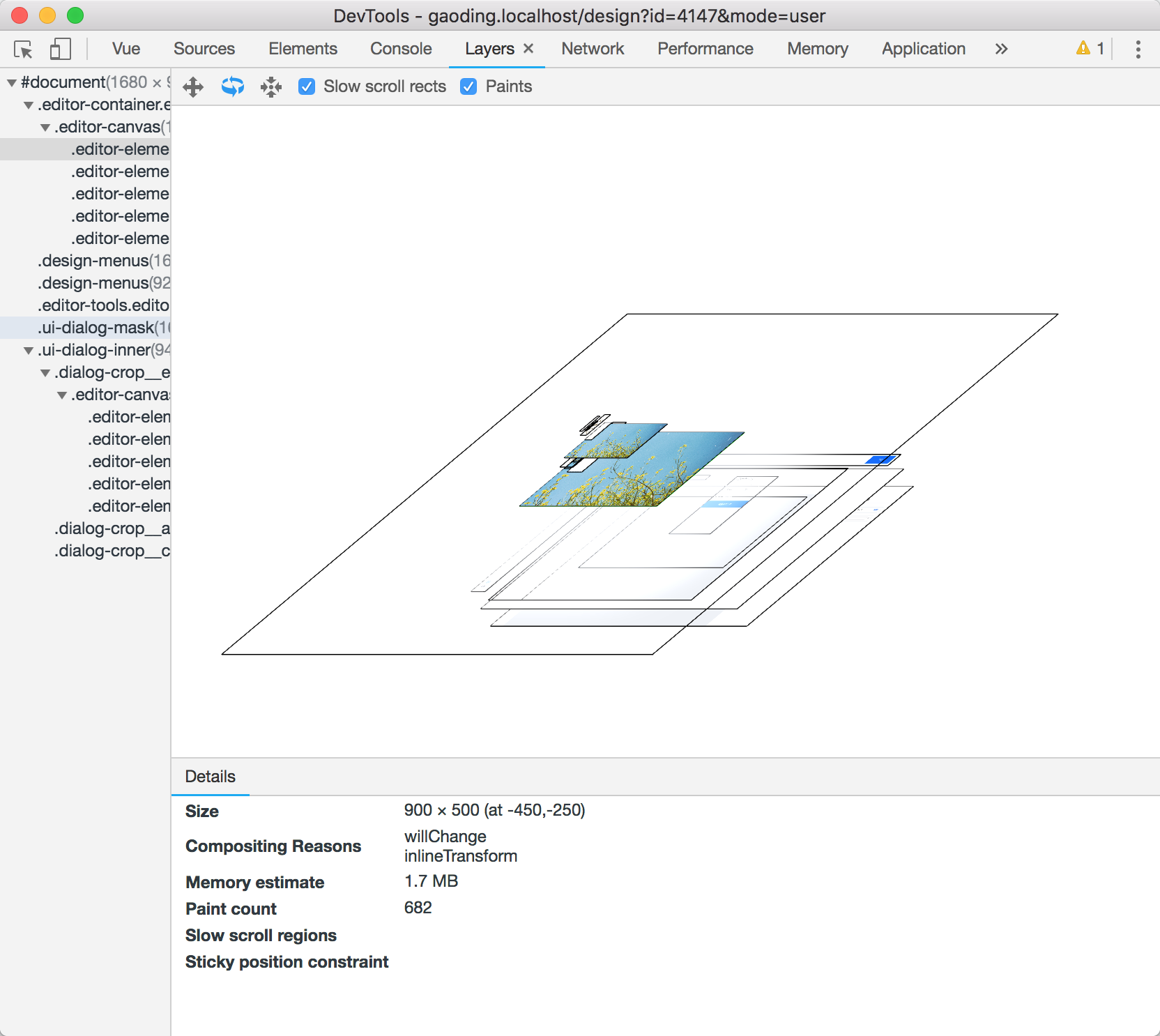这里 GPU Memory 被占满了。虽然这个提示信息现在看来很明显是与硬件加速有关的,但在没有相关经历的情况下我们还是没有确定它与具体代码之间的关联。直到我们偶然查看 Chrome 设计文档中关于 Compositing 的介绍时,发现了一个行为:Blink 会将 DOM 节点映射到 LayoutObject 的渲染树,这棵树中的节点理论上每个都能具备到渲染后端的上下文,但为了节约资源 Chrome 会将它们做一些合并后再渲染。而这时存在 CSS 定位(如绝对定位与 transform)的元素是不能合并的,这会造成对显存的额外开销。