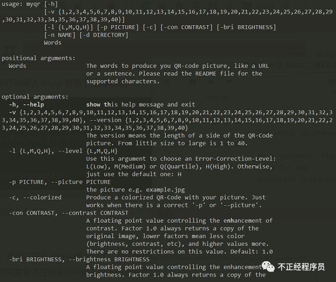 安装完成后,就可以在命令行中输入 myqr 查看下使用帮助: