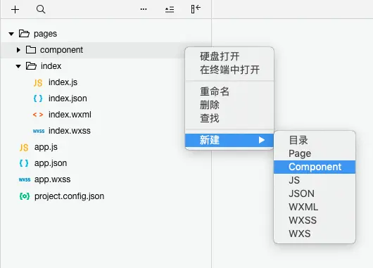 在定好的目录下右键新建一个 Component 目录,系统会自动帮助我们创建好自定义组件的四个必要文件,步骤与结果如图一、二所示。