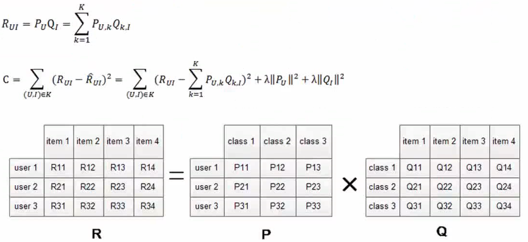 RMSE (均方根误差):其中T为测试集;rui为用户u对物品i的实际评分,r^ui为预测评分。