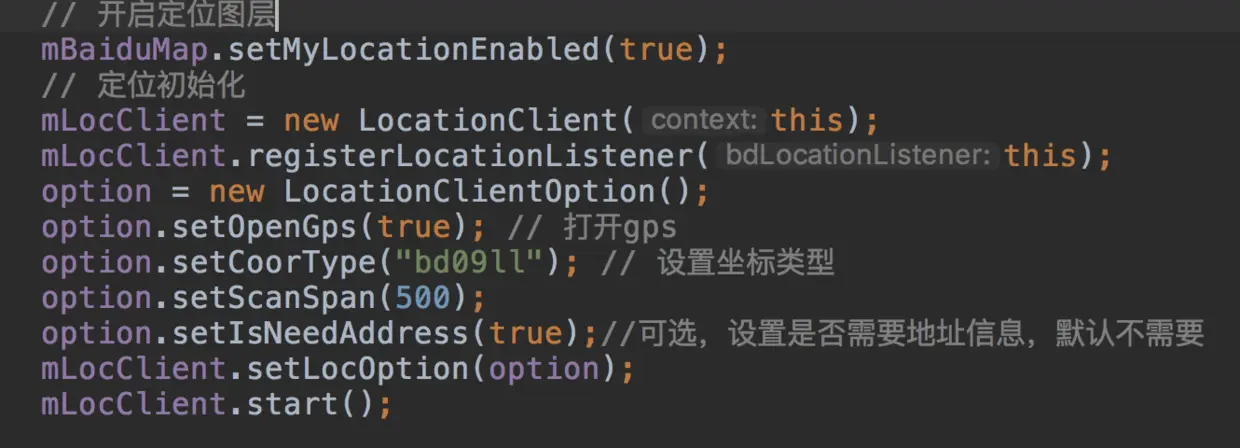 注意一点,定位的最后一句,mLocClient.start();不可以去掉,亲测。