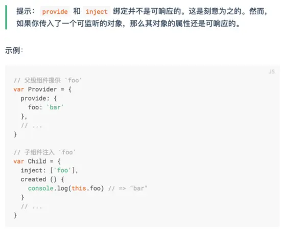 官网给出实例,说本身是不支持数据响应式的, 但是可以传入响应式数据,那么provide,inject就可以实现响应式。