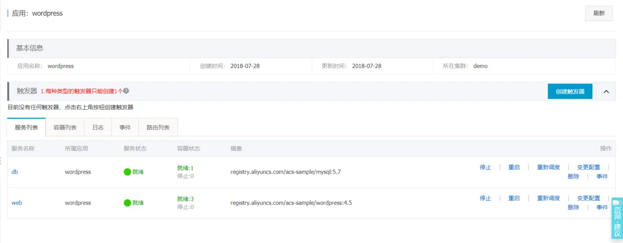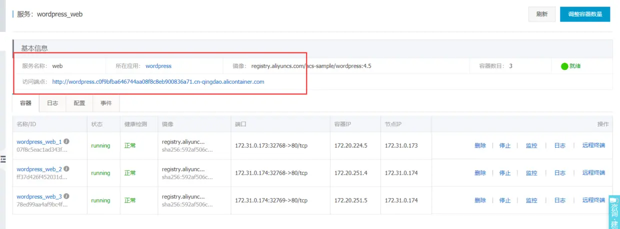 PS:可以通过上边的弹性IP来访问这2台机器,如果ssh访问不了,一般的问题要看下安全组,最后也是最重要的说明,我的演示很成功,我希望大家了解后一定要删除容器服务的demo,要不就一直扣费啊!