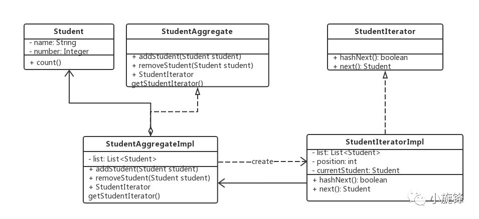 public interface StudentIterator { boolean hashNext(); Student next();}public class StudentIteratorImpl implements StudentIterator{ private List<Student> list; private int position = 0; private Student currentStudent; public StudentIteratorImpl(List<Student> list) { this.list = list; } @Override public boolean hashNext() { return position < list.size(); } @Override public Student next() { currentStudent = list.get(position); position ++; return currentStudent; }}
