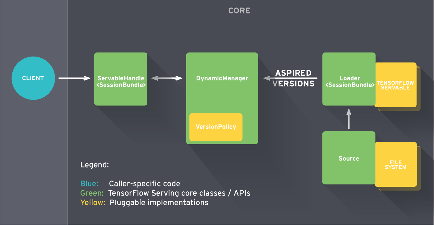 下图为TensorFlow Serving整个框架图。Client端会不断给Manager发送请求,Manager会根据版本管理策略管理模型更新,并将最新的模型计算结果返回给Client端。