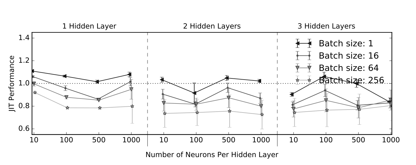 上图显示为不同网络结构,不同Batch Size下使用JIT编译后与不使用JIT编译的耗时之比。可以看出,较大的Batch Size性能优化比较明显,层数与神经元个数变化对JIT编译优化影响不大。