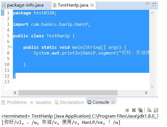 然后试验了一个demo测试,发现报错,然后点击import import com.hankcs.hanlp.HanLP;